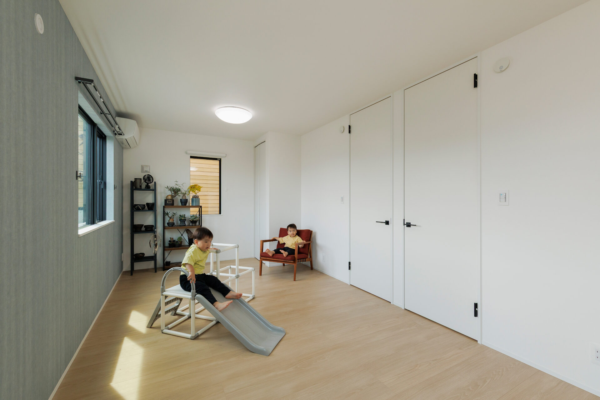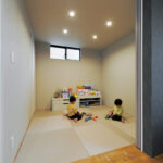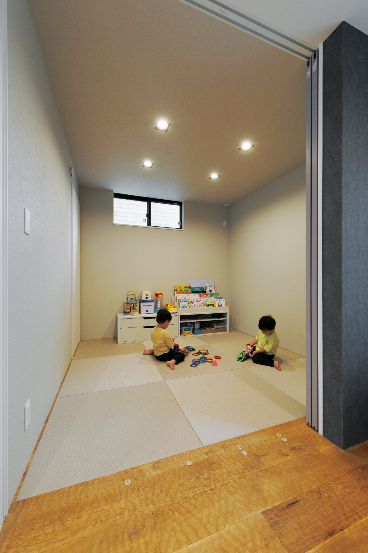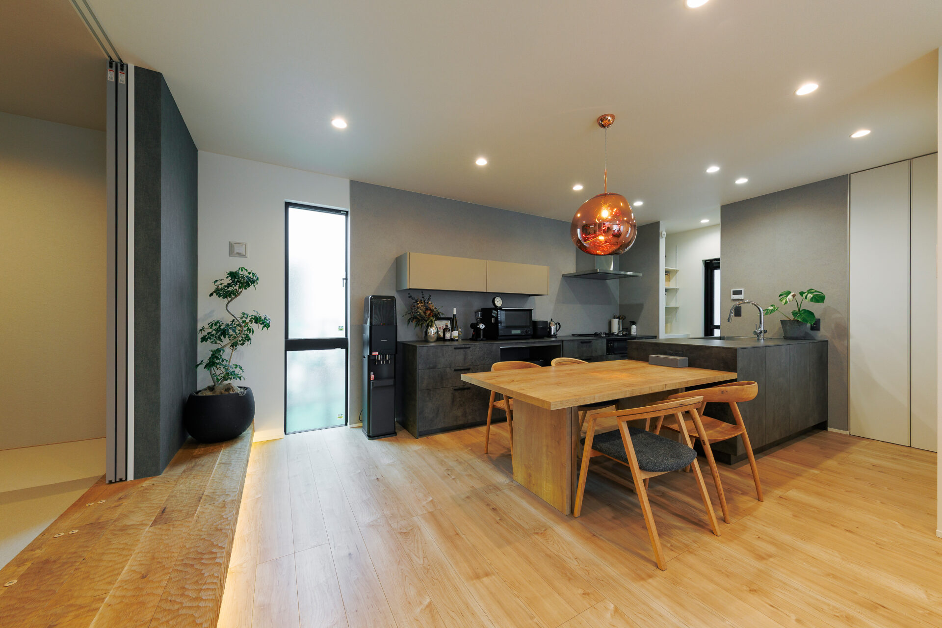 和室の畳は、LDKと馴染むよう、縁なしの灰桜に。逆に、和室LDK側の壁色はアクセントになるよう、布目の黒色のクロスを選択して和を際立たせたました。