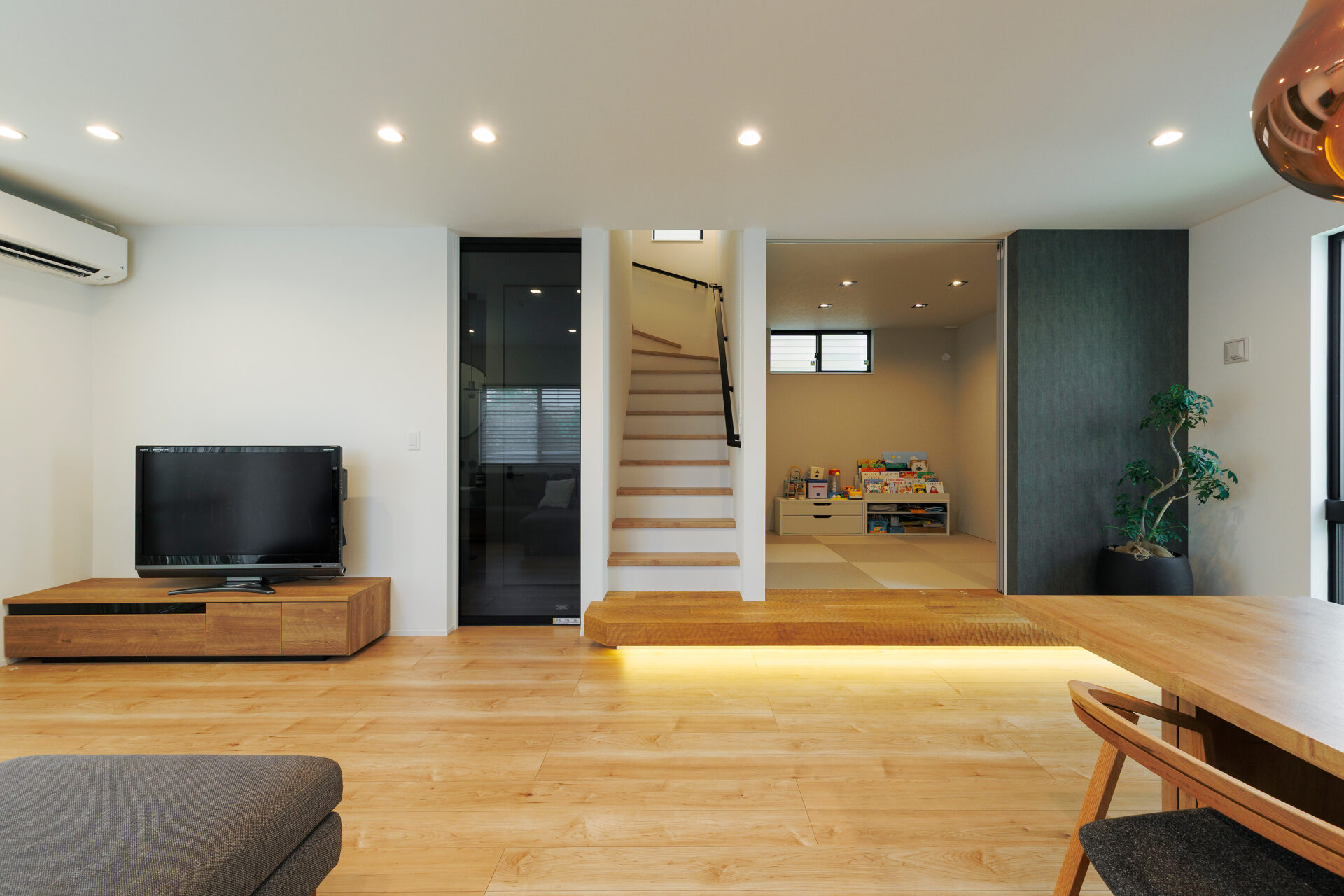 LDKと和室と階段のつながりを意識して階段の1段目に設えることにより、流れるようなリズム感を意識。